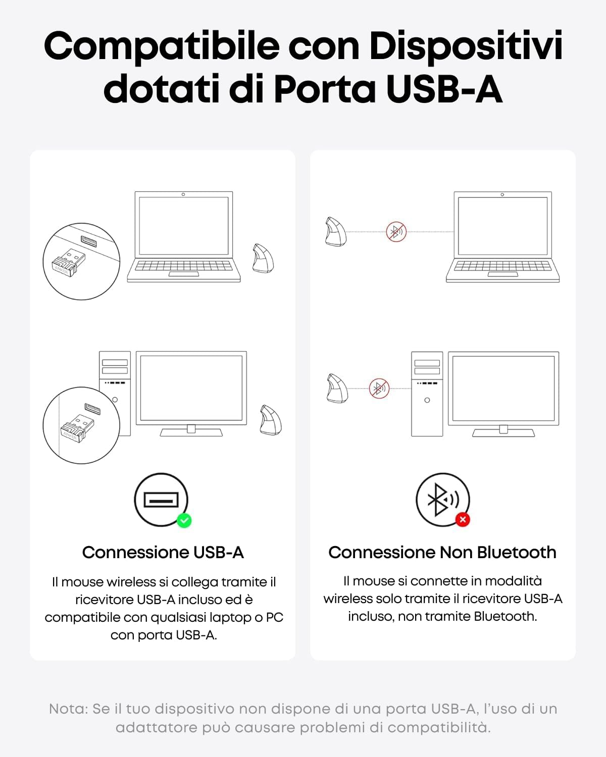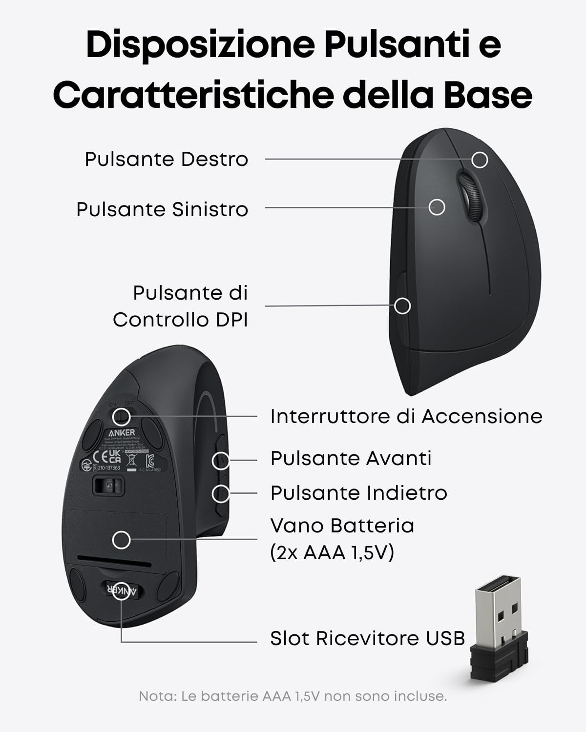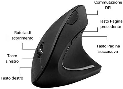 Mouse Ergonomico Verticale Wireless con 3 Livelli DPI (800/1200/1600), Design Antistress per Polso e Mano, Connessione Stabile USB, Ideale per Ufficio e Home Working