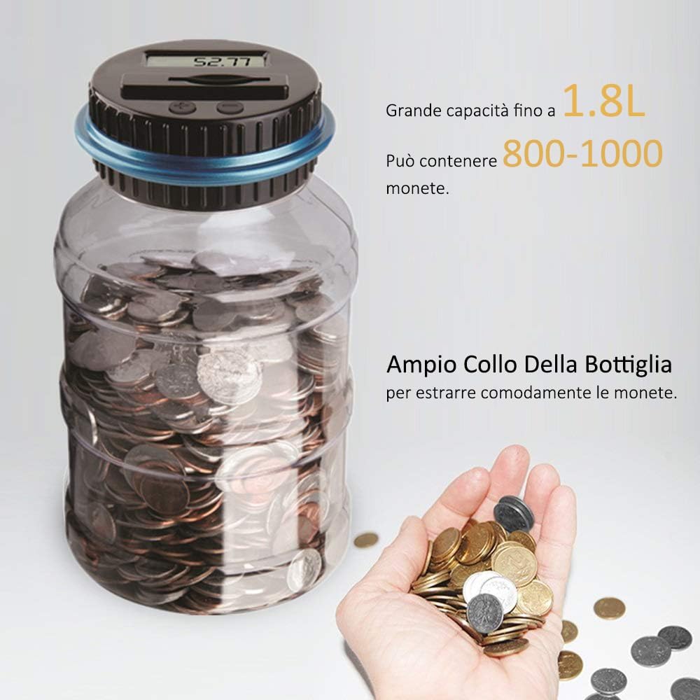 - [Grande Capacità] - Accetta tutte le monete circolanti nell'UE. La grande capacità, fino a 1,8L, consente di conservare 800-1000 monete. Risparmiando una moneta al giorno, è possibile utilizzarla per almeno 2 anni. Il modo corretto di inserire una moneta: tenere la moneta con le dita e inserirla lentamente nella fessura, non troppo velocemente