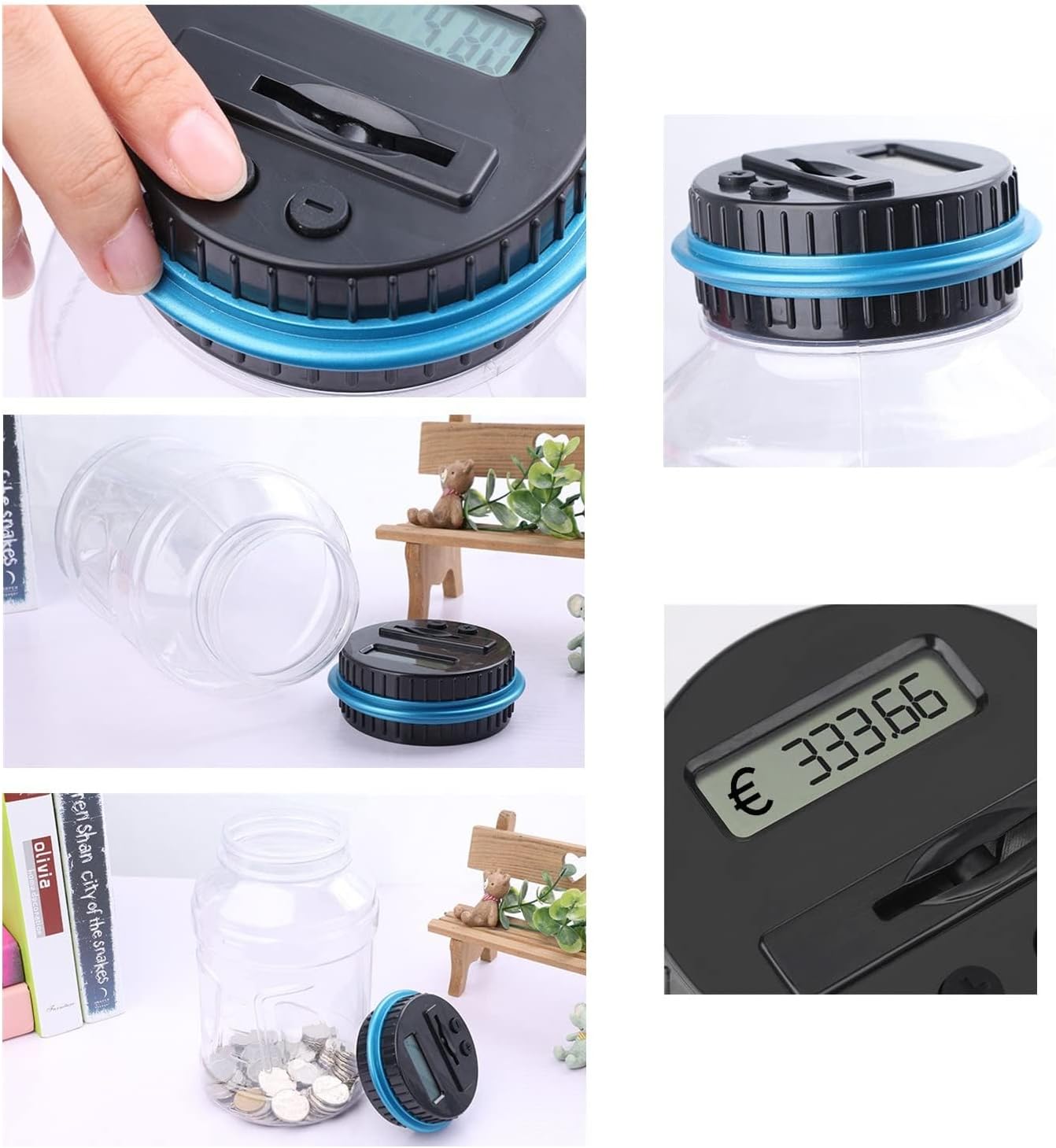 - [Conteggio Automatico] - Il barattolo per il risparmio è dotato di uno schermo LCD sul coperchio che aiuta a calcolare il numero di monete nella fessura. Calcola accuratamente il denaro e visualizza l'importo totale di ogni deposito. Inoltre, i pulsanti +/- sul coperchio consentono un'impostazione manuale molto semplice