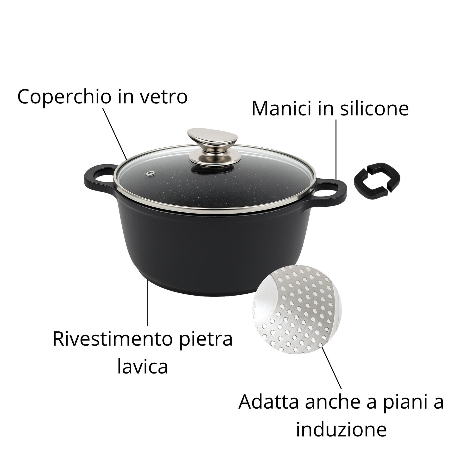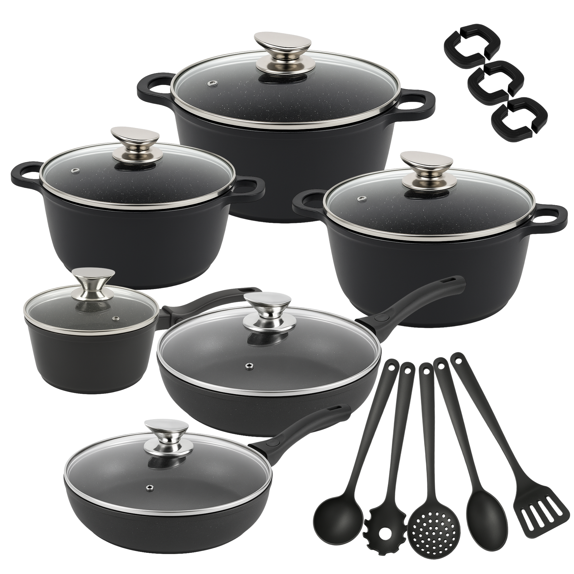 Set di Pentole 23 Pezzi Antiaderente con Coperchi in Vetro – Batteria di Pentole e Padelle con Manici Removibili, Mestoli e Accessori in Silicone – Adatte a Tutti i Piani di Cottura, Induzione Inclusa
